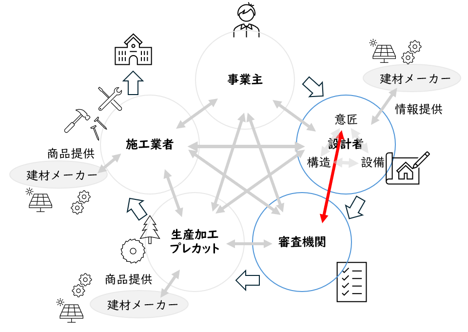 建方(たてかた)氏:意匠設計者。木造住宅を中心に設計を行っている。通常は旧4号特例申請や木造3階建ての申請図書を作成してきた。