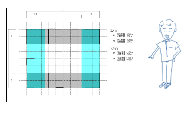 最初の壁量・バランス検討は、いわゆる壁量係数で必要壁量が設計壁量を満足している検定ですよね。バランスは四分割法のことかな。