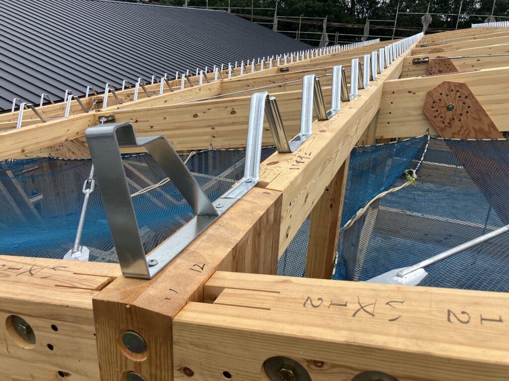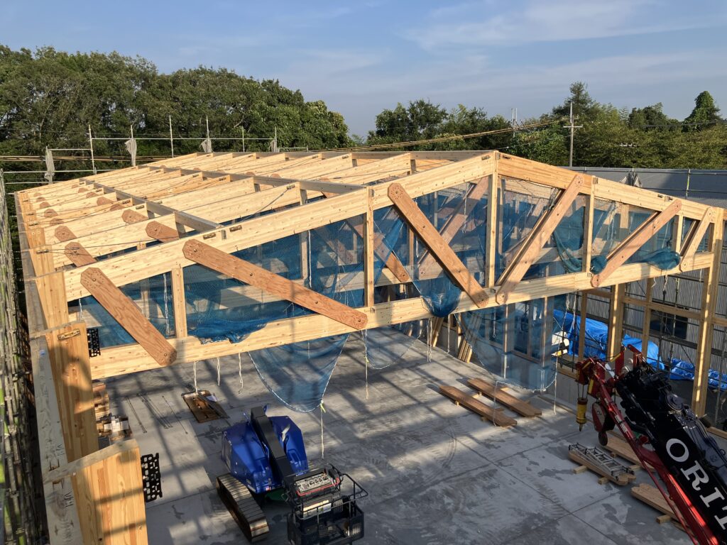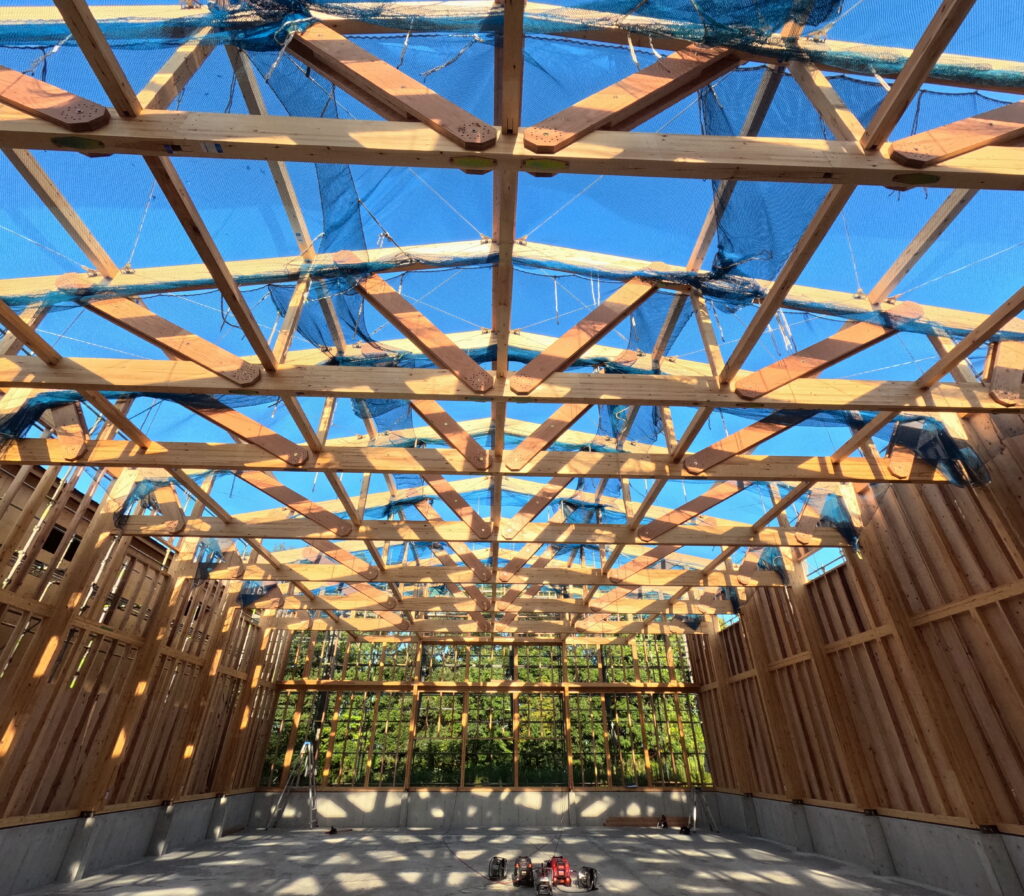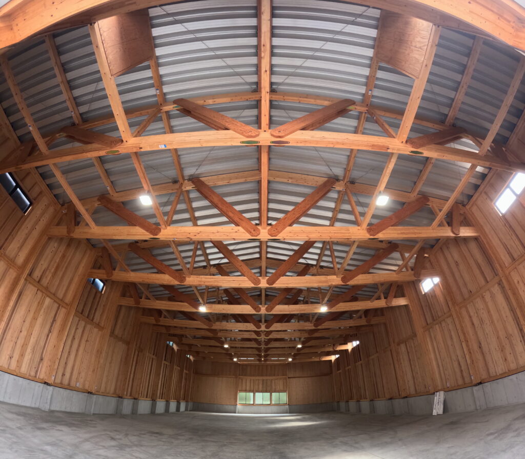 モデルプランを元に建築された木造倉庫。採用したWHフレームシステムは、トラス構造を基本とし、水平力に抵抗することで梁間方向の耐力壁を必要としない特長をもつ。スパン16mの無柱・大空間は、このシステムによって特注材や製作金物を使用せず、一般流通材や既製品接合金物で実現している。特殊な加工や設定によりプレカット図面の入力が難航し、加工データのすり合わせや現場での施工可否の検討に苦労したが、鉄骨造と比較して建築コストは大幅な削減となった。天井には平行弦トラスを使用しており、BXカネシンからはトラス接合用の接合金物「MPねじ接合システムtype-L」を納品した。